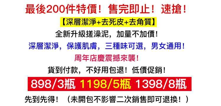 【熱銷款】全新升級搓澡泥,加量不加價,最後200件特價!深層清潔++去死皮+去角質!污垢吸出來,一搓白白白!男女通用! 【低至$174/瓶】